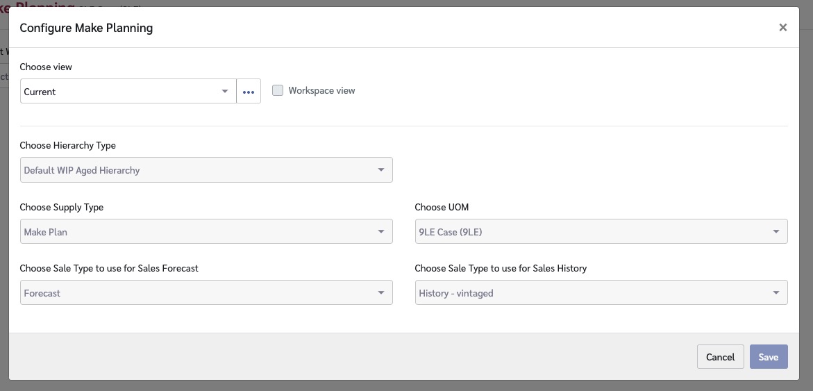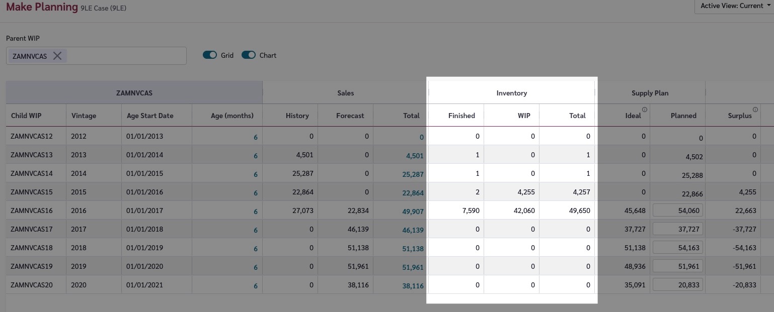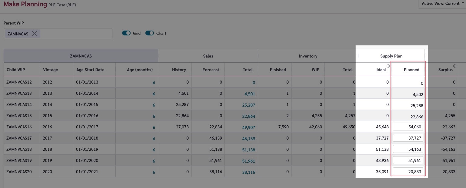 This figure is read from the Supply Plan selected in the view configuration (see[ Viewing the Make Plan ](#viewing-the-make-plan)) and is the total of all planned make for that child WIP. You can update this here in the Make Planning screen, and this will then update back into the Supply Plan.