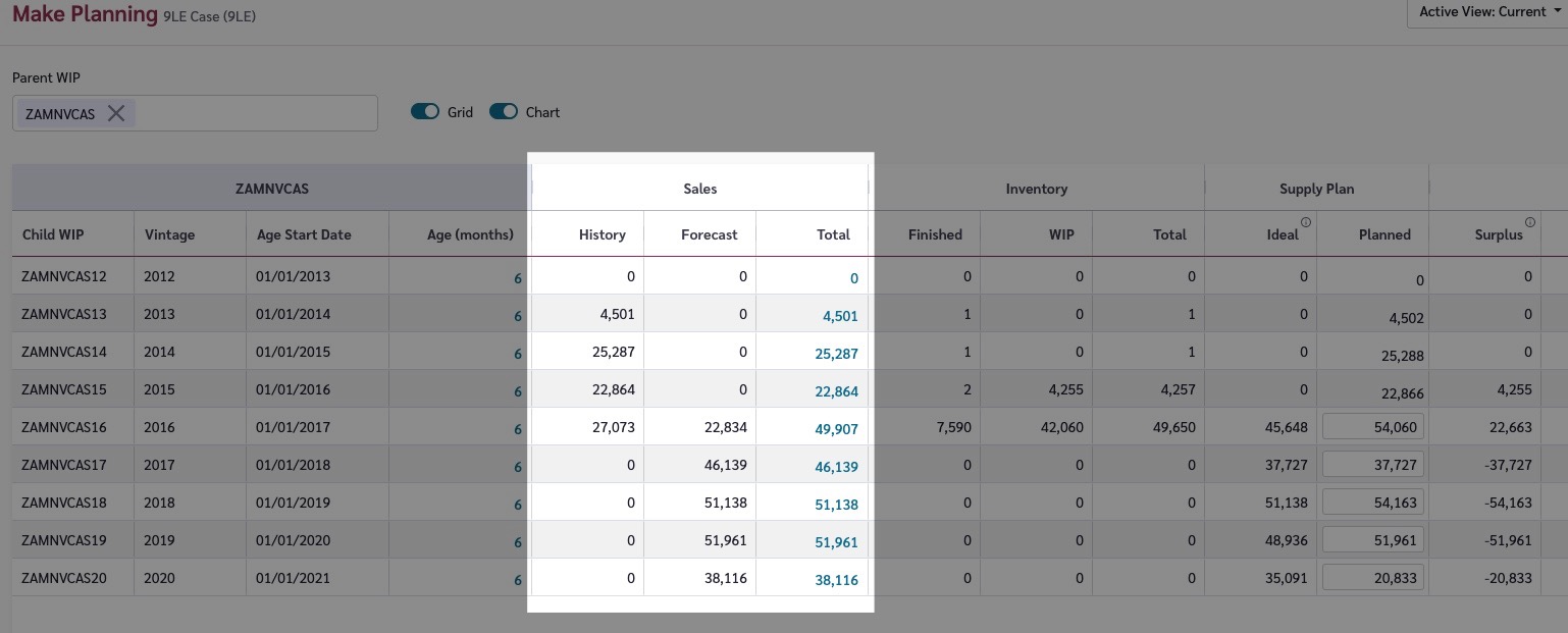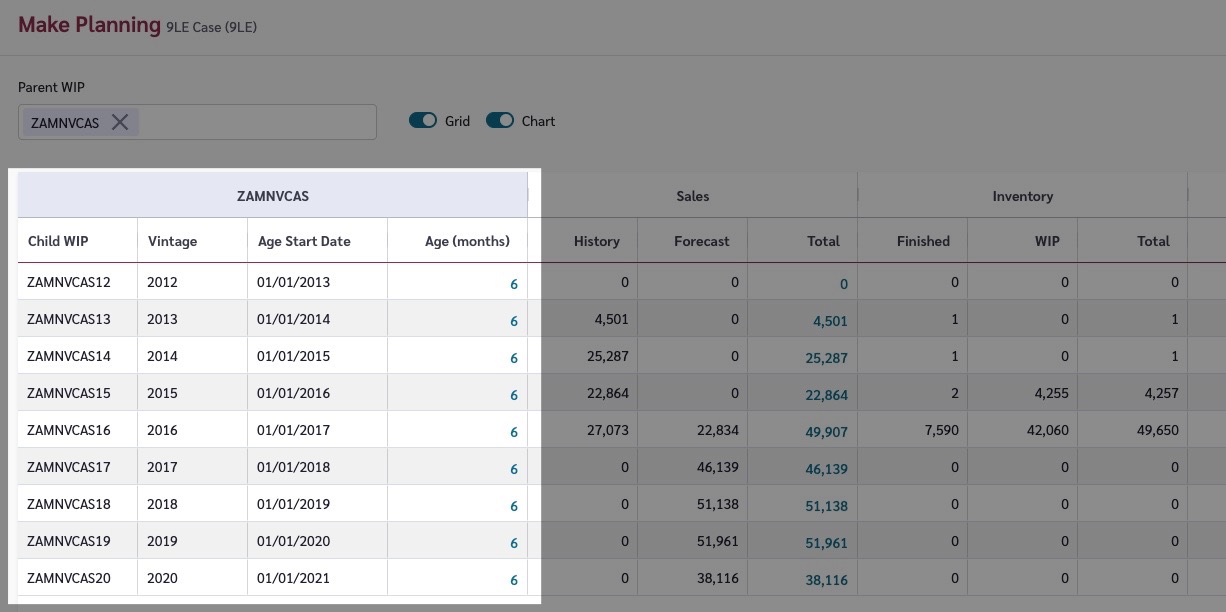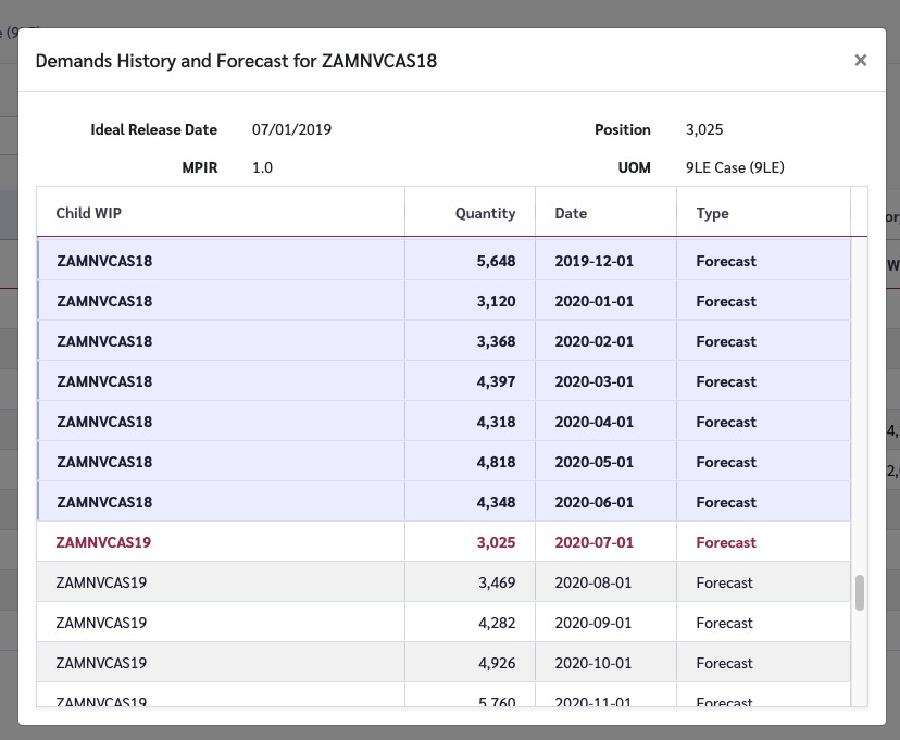 1. Sales - History - Sales History for a Child WIP is determined by looking at all the items which include the WIP in their recipe. For example - if finished good item 123SVC15 contains ZAMNVCAS15 as part of it's recipe, then sales of 123SVC15 will be included in the Sales History for ZAMNVCAS15.