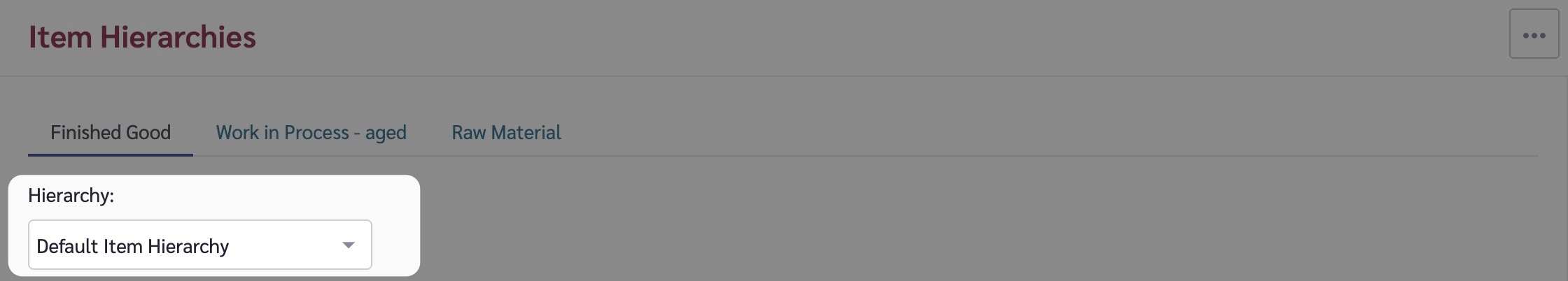 * Work in Process - this hierarchy defines the levels of the items that form ingredients for your finished goods. For example, in the wine industry, these items would be the bulk wine that is then bottled into your finished good items. This hierarchy is pre-defined and only has 2 levels.