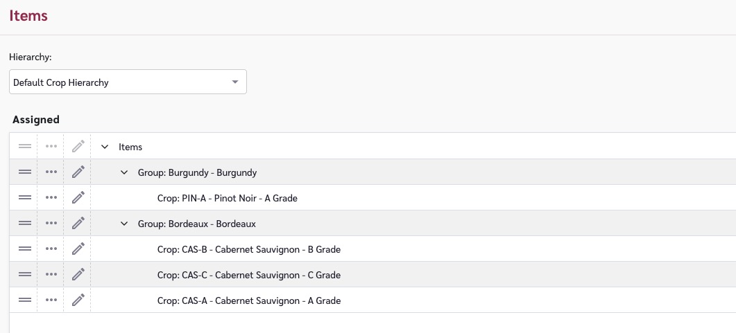 Crop Items are another type of 'Item' within Claret and are used to manage raw material, crop-based, inputs into your work in process and finished good items - generally, grapes.
