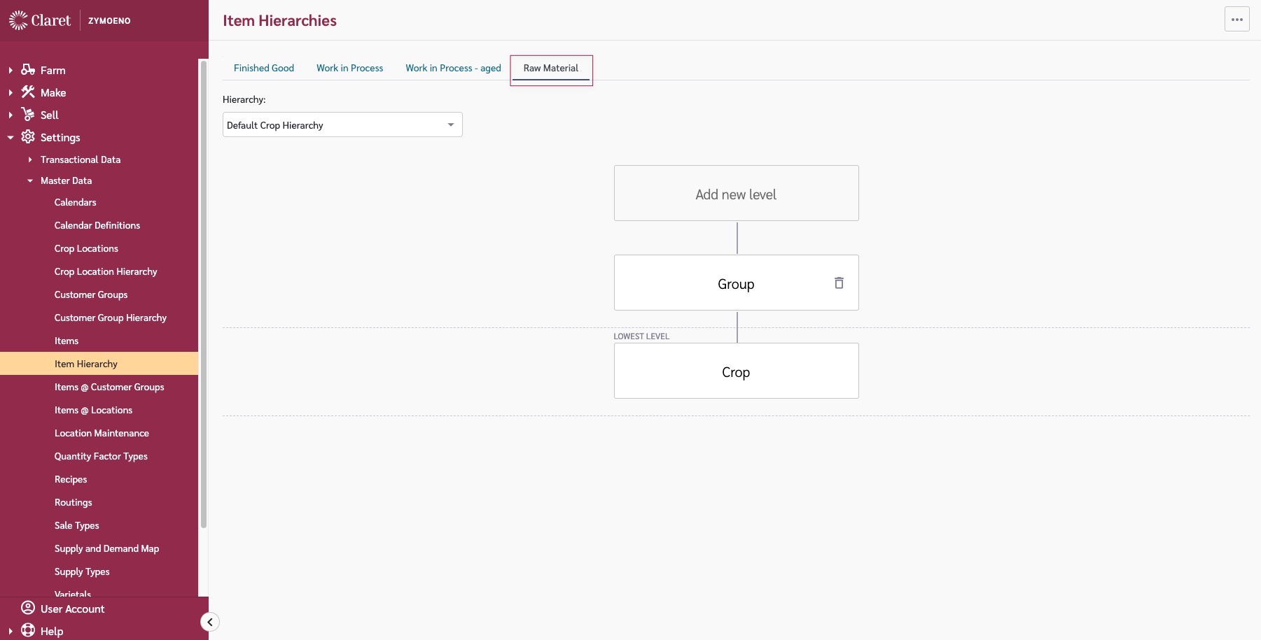 The Crop Item Hierarchy is set up on the 'Item Hierarchy' page, on the 'Raw Material' tab.