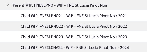 <table><thead><tr><th width="139">Parent WIP</th><th width="227">Parent WIP Description</th><th width="152">Current Vintage</th><th width="139">Child WIP</th><th width="255">Child WIP Description</th><th width="183">Routing</th><th>Vintage</th><th width="100">Age-Start</th></tr></thead><tbody><tr><td>FNESLPNO</td><td>FNE St Lucia Pinot Noir</td><td>2022</td><td>FNESLPNO21</td><td>FNE St Lucia Pinot Noir 2021</td><td>Standard Pinot Noir</td><td>2021</td><td>2022-01-01</td></tr><tr><td>FNESLPNO</td><td>FNE St Lucia Pinot Noir</td><td>2022</td><td>FNESLPNO22</td><td>FNE St Lucia Pinot Noir 2022</td><td>Standard Pinot Noir</td><td>2022</td><td>2023-01-01</td></tr><tr><td>FNESLPNO</td><td>FNE St Lucia Pinot Noir</td><td>2022</td><td>FNESLPNO23</td><td>FNE St Lucia Pinot Noir 2023</td><td>Standard Pinot Noir</td><td>2023</td><td>2024-01-01</td></tr><tr><td>FNESLPNO</td><td>FNE St Lucia Pinot Noir</td><td>2022</td><td>FNESLPNO24</td><td>FNE St Lucia Pinot Noir 2024</td><td>Standard Pinot Noir</td><td>2024</td><td>2025-01-01</td></tr></tbody></table>