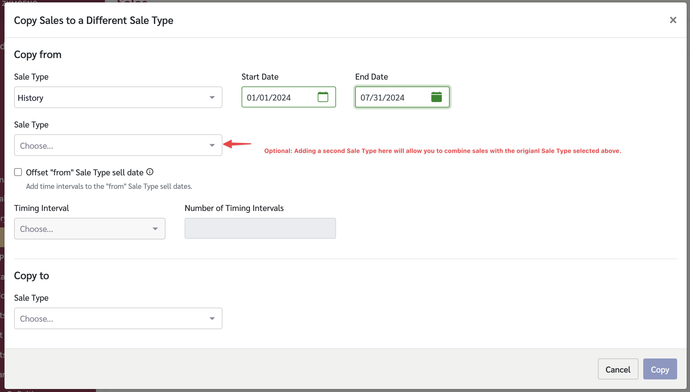 If you select more than one 'Copy From' Sale Type with overlapping start and end dates, any sales records which overlap will be added together in the 'Copy To' Sale Type.