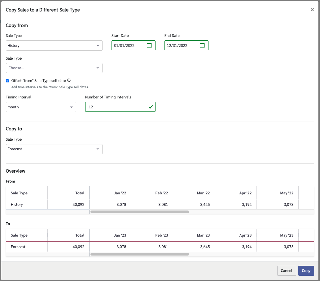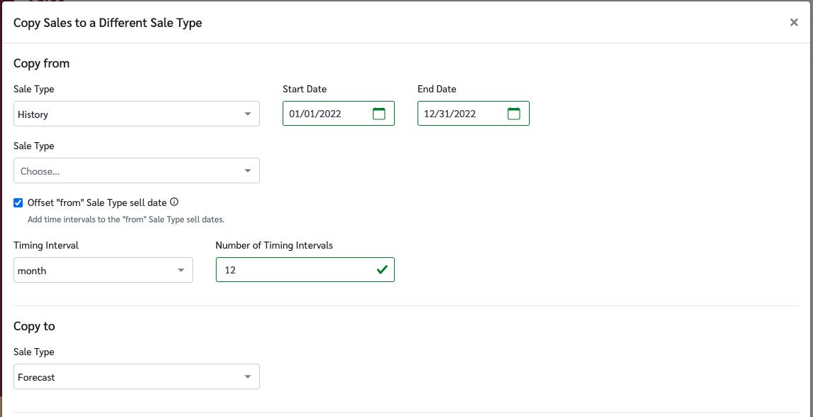 * *Offset "from" Sales Type sell date -* check this if you wish to copy the data to a different set of dates than the original dates in the data. For example, if you are copying the data from last year to this year, then you would want to offset the data by 12 months. However if you are copying this year's budget to this year's forecast then you would not want to offset the dates.