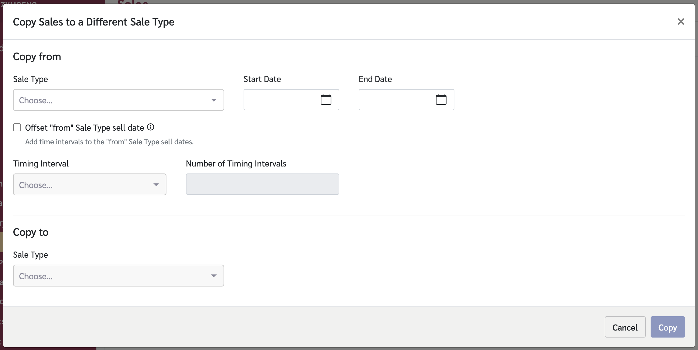 Here you will select the Sale Type you want to copy data from, and the sale type you would like to copy data to. Make selections as follows: